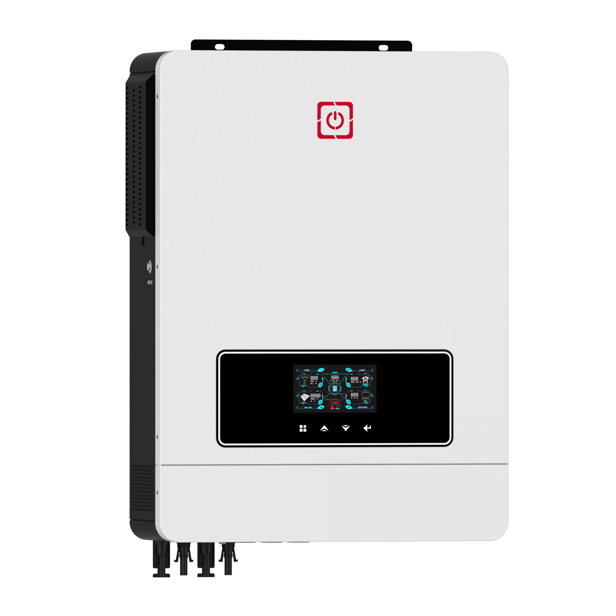 Hybrid DC/AC inverter for solar power systems with single-phase output and LCD display.