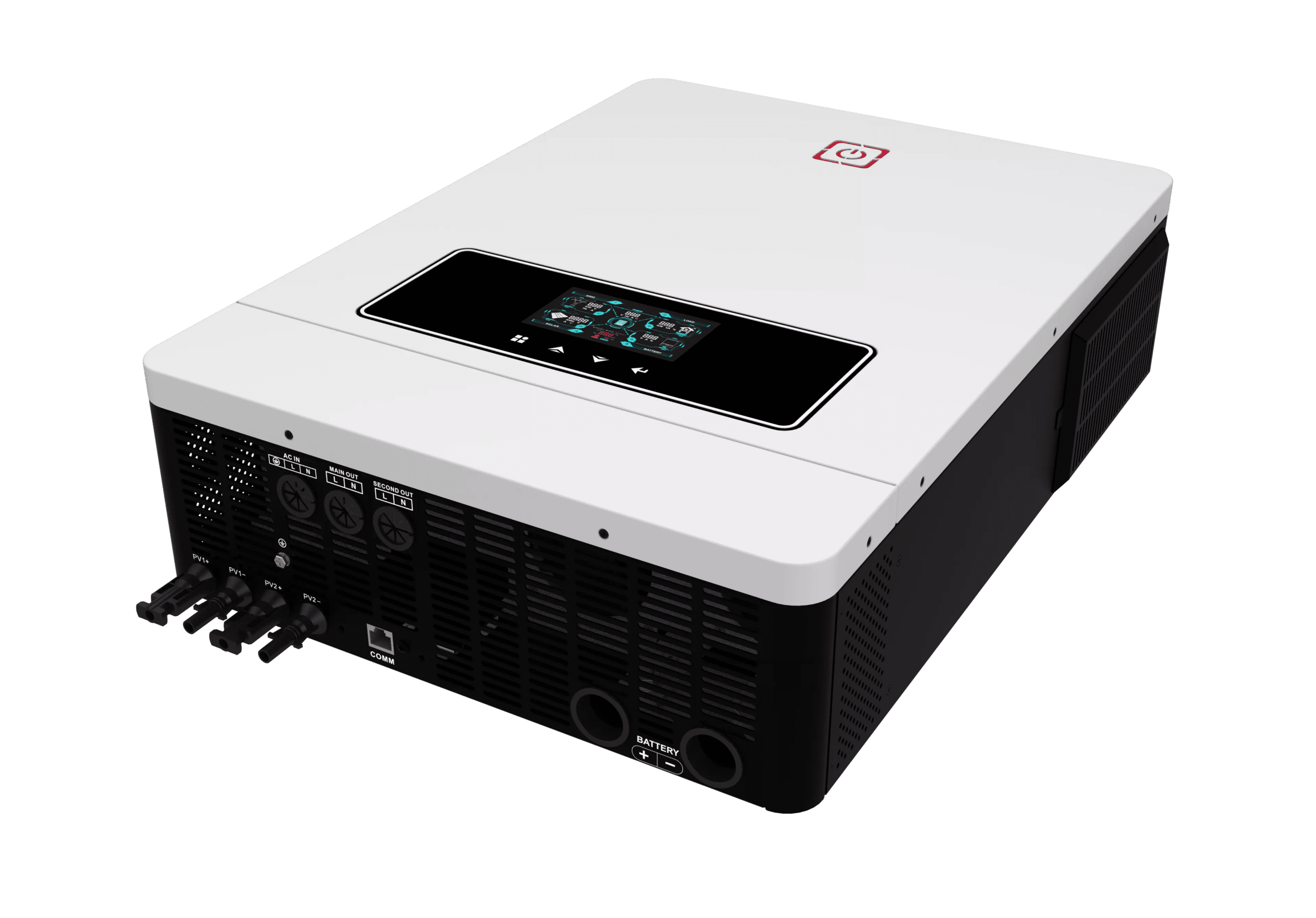 Pure sine wave hybrid solar inverter supporting on-grid and off-grid operation. High voltage PV input with built-in MPPT solar charger and dual output.